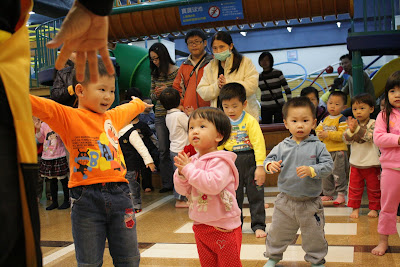 中間有十分鐘,有老師進來帶小朋友唱歌跳舞。小肉包本來在一旁玩得很開心,卻硬被我拉去和大家一起做活動。